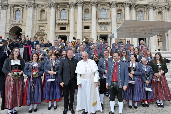 Direkt vor dem Heiligen Vater und tausenden Menschen das katholische Oberschwaben zu repräsentieren und aufzuspielen, zudem Live im Fernsehen übertragen zu werden, das hat Einmaligkeitscharakter. Doch nicht genug: Nach der Audienz gesellte sich Papst Franziskus persönlich inmitten unserer Musikkapelle, ließ sich mit uns fotografieren und schüttelte Hände. Möglich wurde die einmalige Begegnung durch «unseren Kurt», der seit 10 Jahren als Dekan und Stadtpfarrer in Davos tätig ist. Dort hat ihn unser Verein auch schon anlässlich eines Vereinsausflugs besucht. Durch die Päpstliche Schweizer Garde, sechs Gardisten stammen aus seiner Stadtpfarrei Davos, und das jährlich in Davos stattfindende Weltwirtschaftsforum, zudem auch immer Kardinäle und hohe kirchliche Würdenträger aus dem Vatikan anreisen, wurde diese außergewöhnliche Begegnung mit Papst Franziskus überhaupt erst möglich.